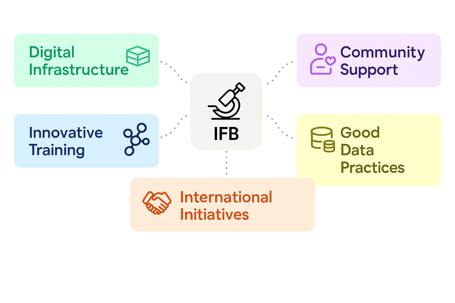 The IFB stands out from other INBS (National Institutes of Biology and Health) by its transversal and technological nature. It is not specialized in a specific field of application or societal themes. It is aimed at the bioinformatics community as well as the various life sciences communities including the environment, and covers large-scale data processing (structural biology, proteomics, sequencing, metabolic, imaging, etc.) on living systems, interfacing with many other INBS.