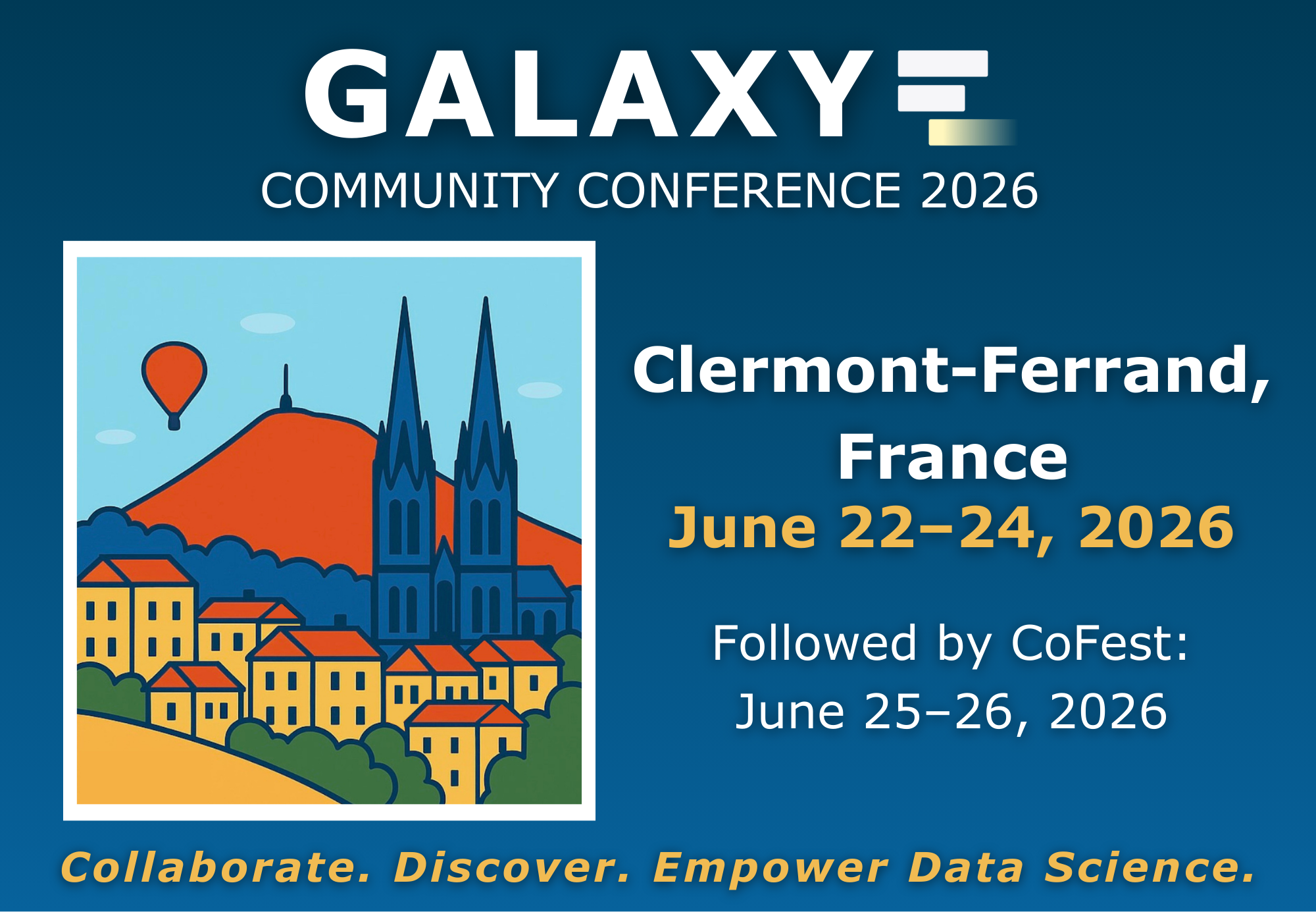 La Galaxy Community Conference 2026 (GCC2026), l’événement phare de la communauté Galaxy, co-organisé par l’Université Clermont Auvergne (UCA), l’Institut Français de Bioinformatique (IFB/ELIXIR-FR) et Johns Hopkins University, se tiendra du 22 au 24 juin 2026 à Clermont-Ferrand (63), suivie du CoFest les 25 et 26 juin.