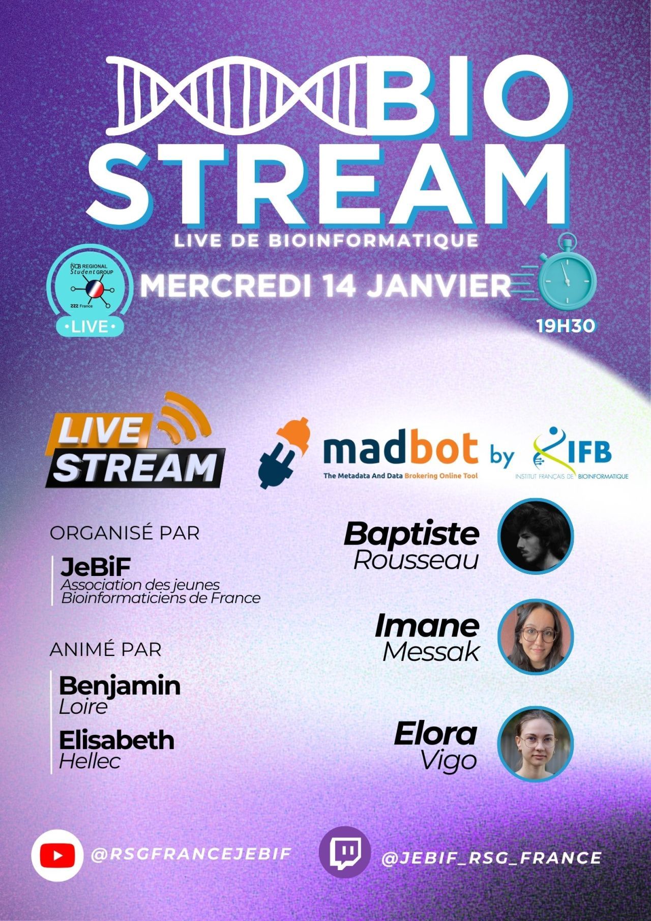 Le 14 janvier, Imane Messak, Baptiste Rousseau et Elora Vigo étaient les invités des JeBif pour présenter madbot dans ce 1er Biostream de l’année. Le BioStream est l’émission live mensuelle sur YouTube et Twitch de l’association des jeunes bioinformaticiens de France(JeBif) ! Vous ne l’avez pas vu ? Découvrez le replay sur YouTube ou écoutez le podcast !