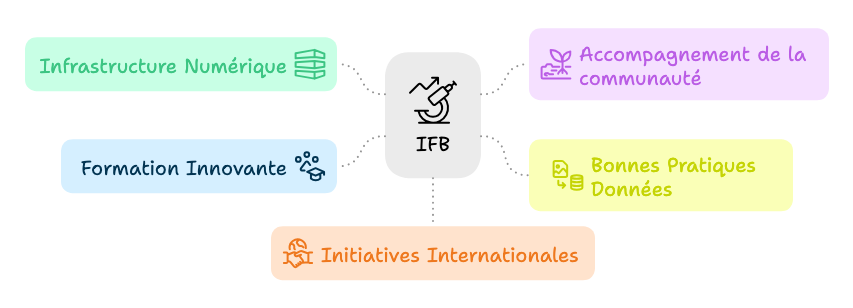 L’IFB est dirigé par une équipe de direction structurée autour d’une directrice, d’une secrétaire générale et deux directeurs adjoints en charge de la coordination scientifique, des relations internationales et du réseau national des plateformes. Cette équipe se réunit de manière hebdomadaire pour assurer la continuité opérationnelle et stratégique des activités de l’infrastructure.