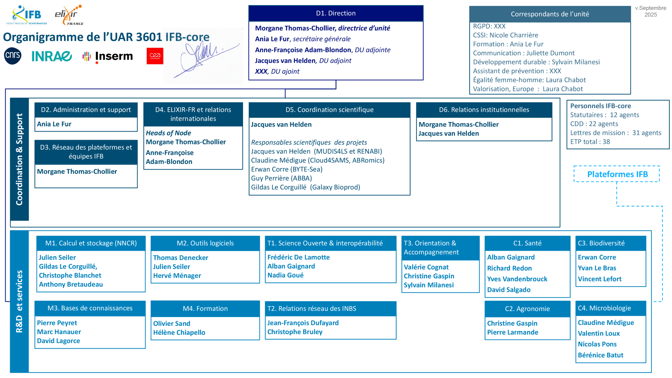 L’IFB-core assure la coordination scientifique, technique et administrative de l’infrastructure. En effet, l’unité orchestre les besoins administratifs de l’IFB / ELIXIR-FR ; coordonne le réseau national d’infrastructures de calcul et de stockage en bioinformatique ; structure la mutualisation les outils, services et formations auprès de la communauté, et représente la France au sein d’ELIXIR.